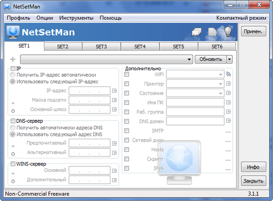 ![]() Хочу предложить вам новую версию программы NetSetMan, с этой маленькой утилитой вы сможете буквально за несколько щелчков мыши изменить все нужные сетевые настройки в вашей системе. Сразу очень сильно хочется заметить тот факт, что за эту версию платить не нужно, есть конечно и платная, отличие в них не существенные, в платной вы сможете создавать бесконечное количество профилей, а в бесплатной только шесть. |
